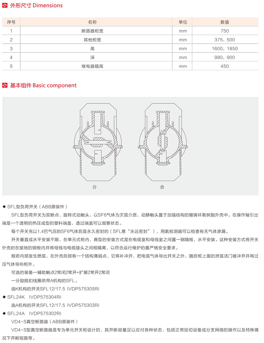 環(huán)網(wǎng)柜的主開(kāi)關(guān)、操作機(jī)構(gòu)及元器件采用ABB公司原裝件或采用進(jìn)口部件國(guó)內(nèi)組裝生產(chǎn)的SFL-12/24型開(kāi)關(guān)設(shè)備,也可根據(jù)用戶需要配裝ABB公司原裝HAD/US型SF6。斷路器或VD4-S型真空斷路器。其操作方式分為手動(dòng)、電動(dòng)兩種。